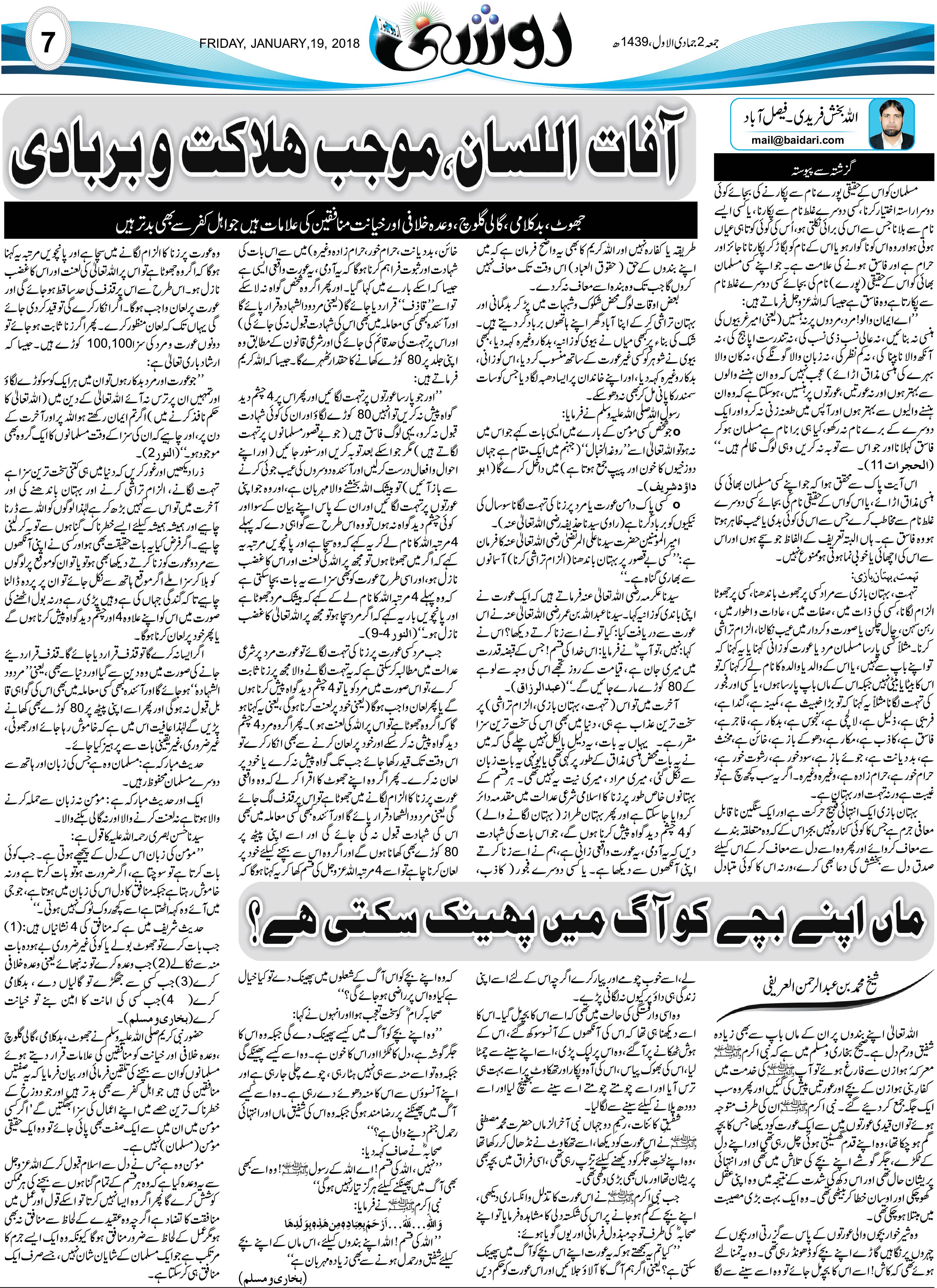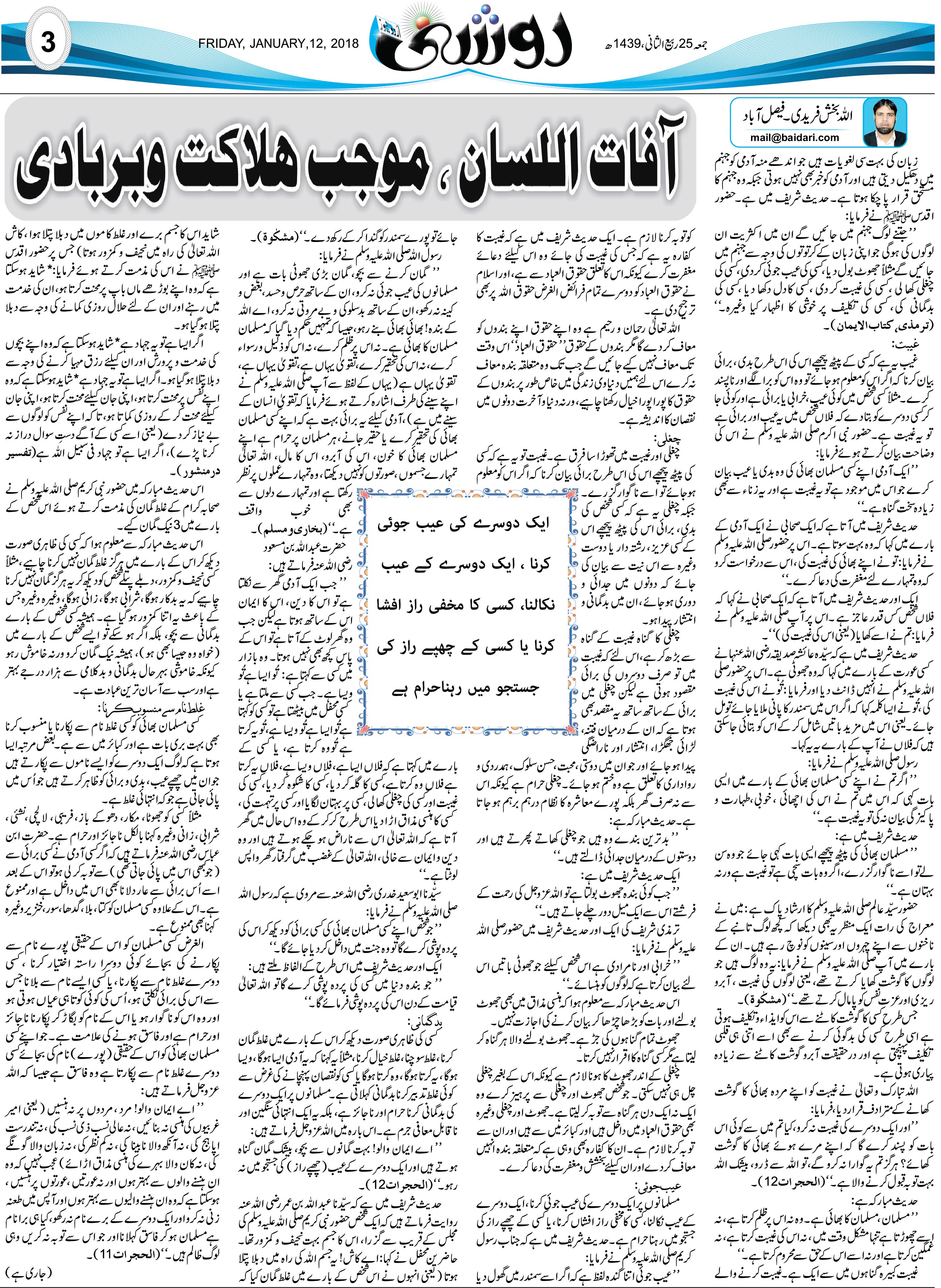 مورخہ 12 جنوری 2018 ، بمطابق 25 ربیع الثانی 1439 ہجری بروز جمتہ المبارک کو جدہ سعودی عرب سے شائع ہونے والے اردو اخبار ” روزنامہ اردو نیوز ” کے جمعہ کے روز شائع ہونے والے سپیشل ایڈمن ” روشنی ” میں شائع ہوا.