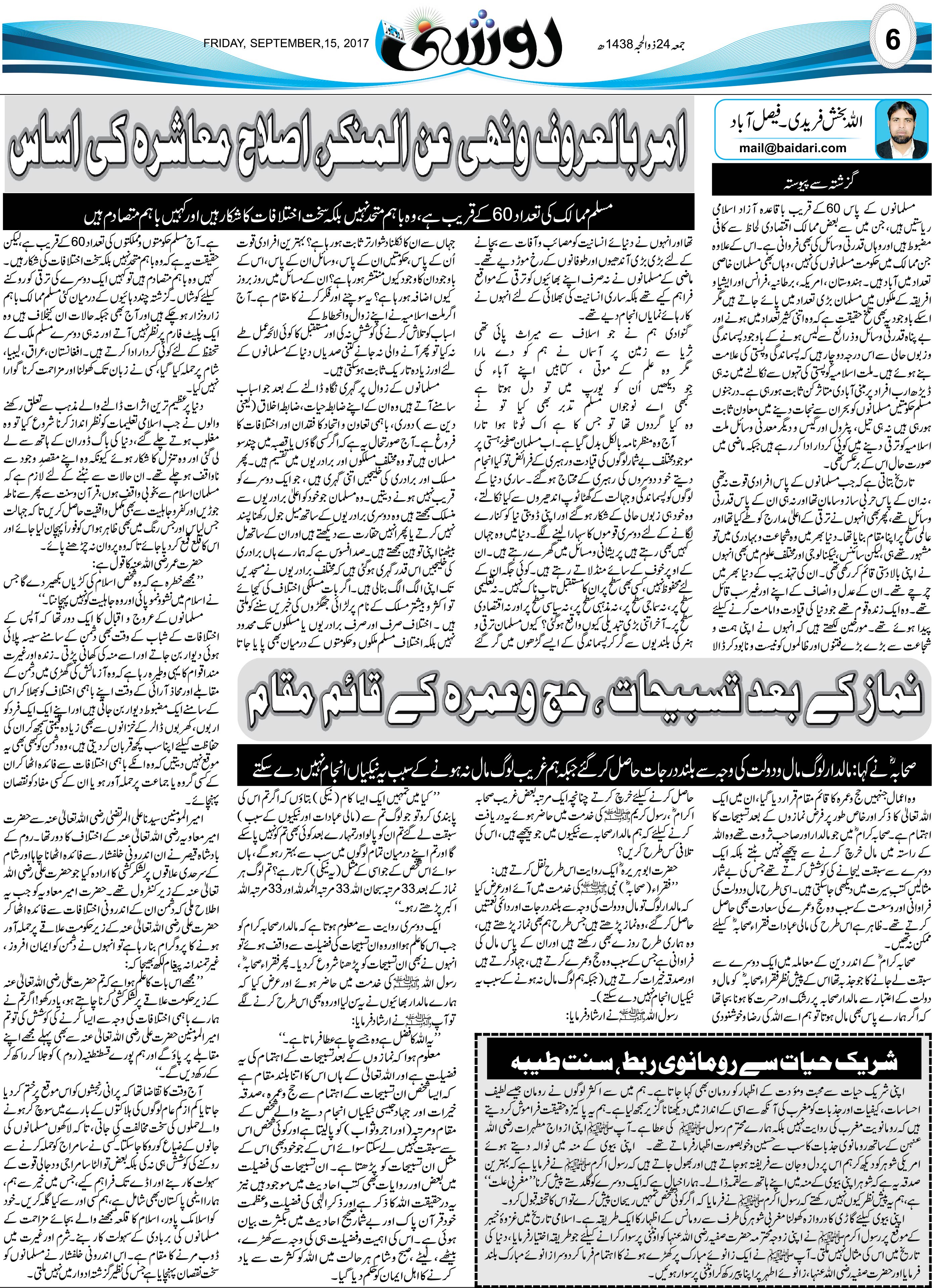 مورخہ 15 ستمبر2017 ، بمطابق 24 ذوالحجہ 1438 ہجری بروز جمتہ المبارک کو جدہ سعودی عرب سے شائع ہونے والے اردو اخبار ” روزنامہ اردو نیوز ” کے جمعہ کے روز شائع ہونے والے سپیشل ایڈمن ” روشنی ” میں شائع ہوا.