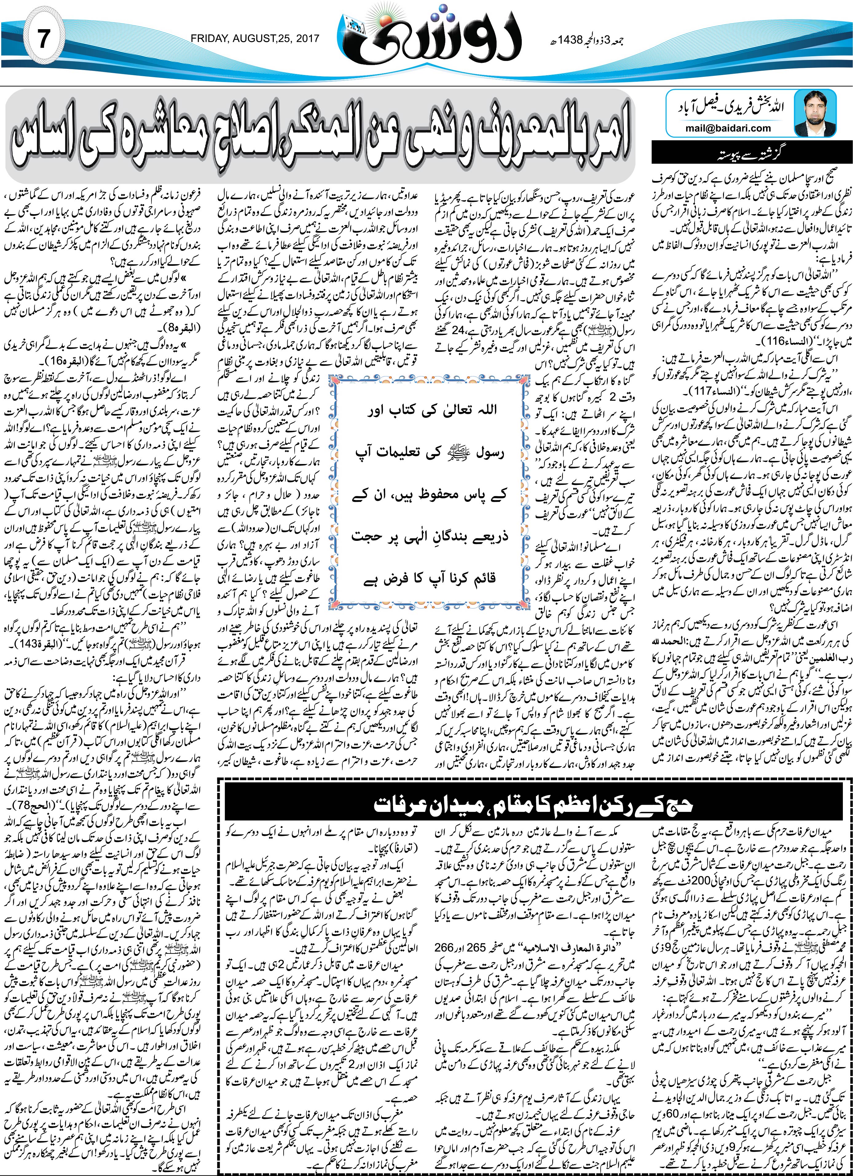 مورخہ 25 اگست 2017 ، بمطابق 3 ذوالحجہ 1438 ہجری بروز جمتہ المبارک کو جدہ سعودی عرب سے شائع ہونے والے اردو اخبار ” روزنامہ اردو نیوز ” کے جمعہ کے روز شائع ہونے والے سپیشل ایڈمن ” روشنی ” میں شائع ہوا.