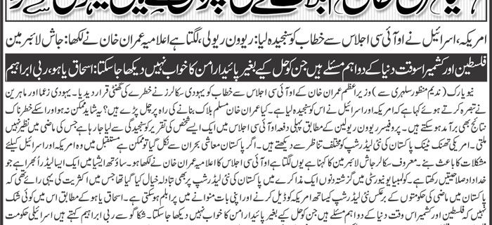اسحاق یاہو کے مطابق اس میں کوئی شک نہیں کہ فلسطین اور کشمیر اس وقت دنیا کے دو اہم مسئلے ہیں جن کوحل کیے بغیر پائیدار امن کا خواب نہیں دیکھا جا سکتا۔ شکاگو سے ربی ابراہیم کہتے ہیں اسرائیلی حکومت فلسطینیوں پر ظلم کر رہی ہے ۔ ہم یہودی ہیں لیکن یہ برداشت نہیں کر سکتے کہ انسانیت کو خون میں نہلایا جائے ۔ پروفیسر اجے کمار شرما کے مطابق بھارت ، امریکہ اور اسرائیل کیلئے عمران خان کی تقریر ضرور پریشانی کا باعث بنے گی کیونکہ یہ تینوں ممالک کبھی نہیں چاہیں گے کہ کوئی جاندار قیادت ان کو للکارئے ۔ پاکستان کی خوش قسمتی ہے کہ ان کو ایک نڈر اور پڑھا لکھا رہبر ملا جو مغرب کو سمجھتا اور اسے انکی زبان میں جواب دینا جانتا ہے ۔