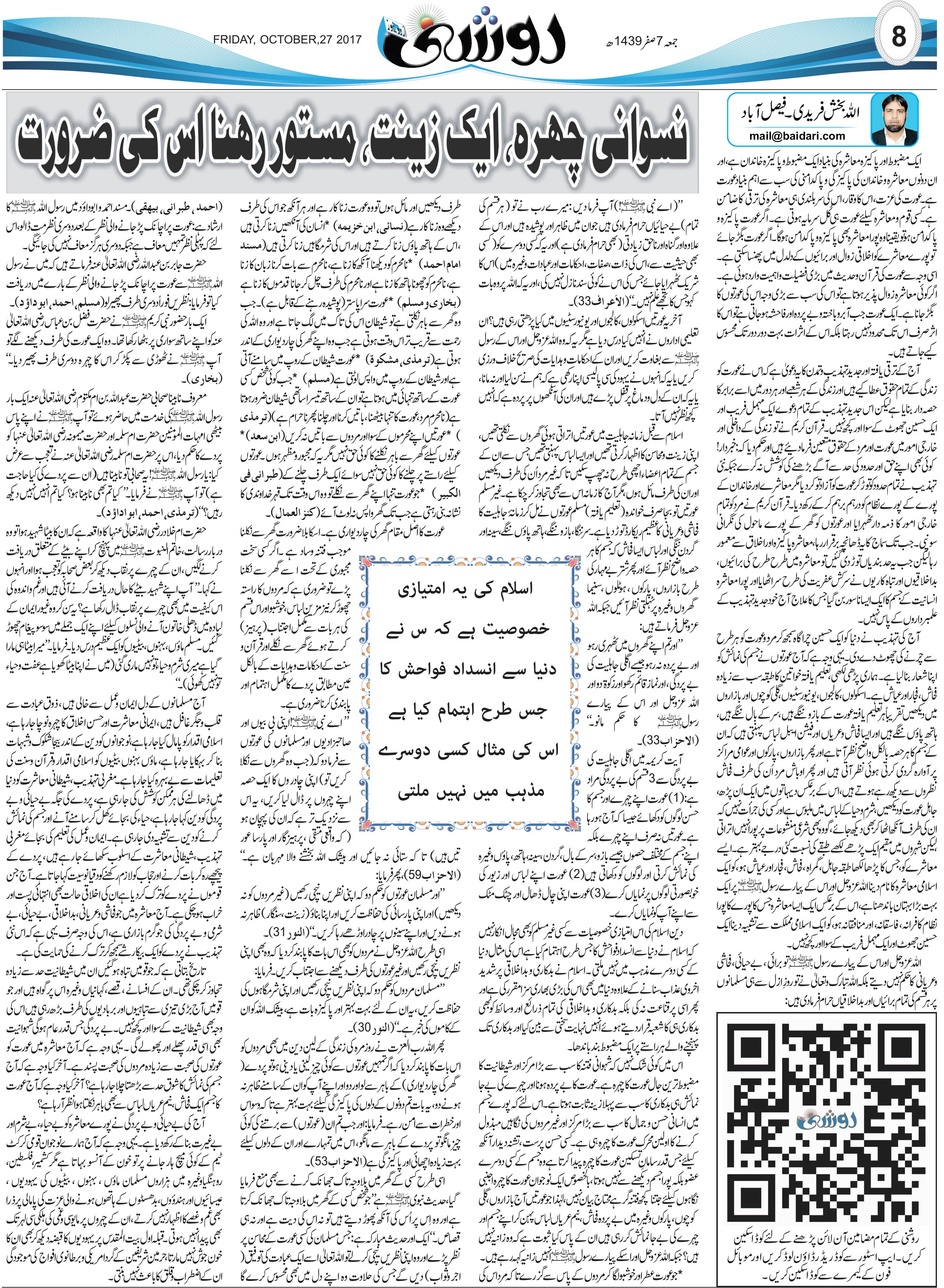مورخہ 27 اکتوبر2017 ، بمطابق 7 صفر المظفر 1439 ہجری بروز جمتہ المبارک کو جدہ سعودی عرب سے شائع ہونے والے اردو اخبار ” روزنامہ اردو نیوز ” کے جمعہ کے روز شائع ہونے والے سپیشل ایڈمن ” روشنی ” میں شائع ہوا.